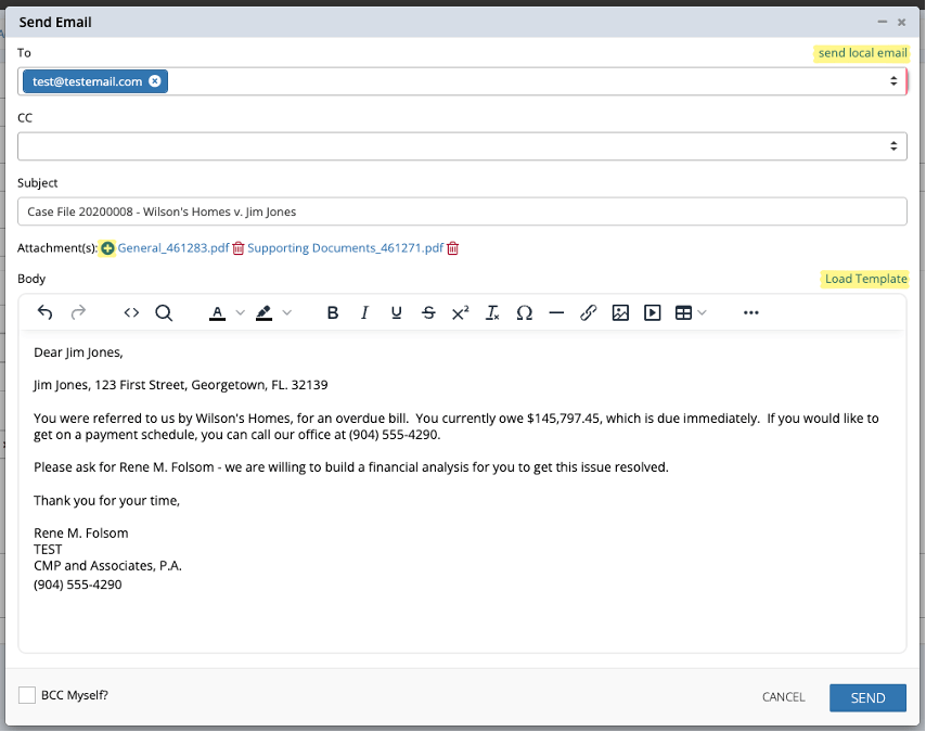 - TEMPLATES: Click Load Template (optional), choose the desired template, and click LOAD to merge relevant case data into the email body